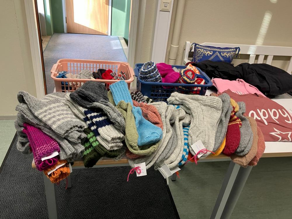 Kässä-marttojen tuottamia villasukkia ja lapasia 17.10.2024 kodittomien yö- tapahtumassa.